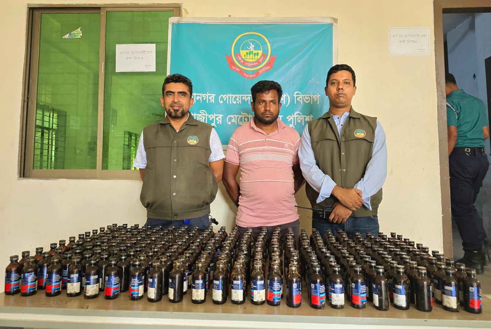 গাজীপুর মহানগরীর বাসন থানা এলাকা থেকে অভিনব কায়দায় বিপুল পরিমাণ ফেনসিডিল পাচারকালে ০১জনকে গ্রেফতার করেছে গাজীপুর মহানগর গোয়েন্দা বিভাগ (দক্ষিণ)। এসময় গ্রেফতারকৃত আসামীর কাছ থেকে ২৮২ বোতল কথিত মাদকদ্রব্য ফেন্সিডিল উদ্ধার করা হয়েছে।