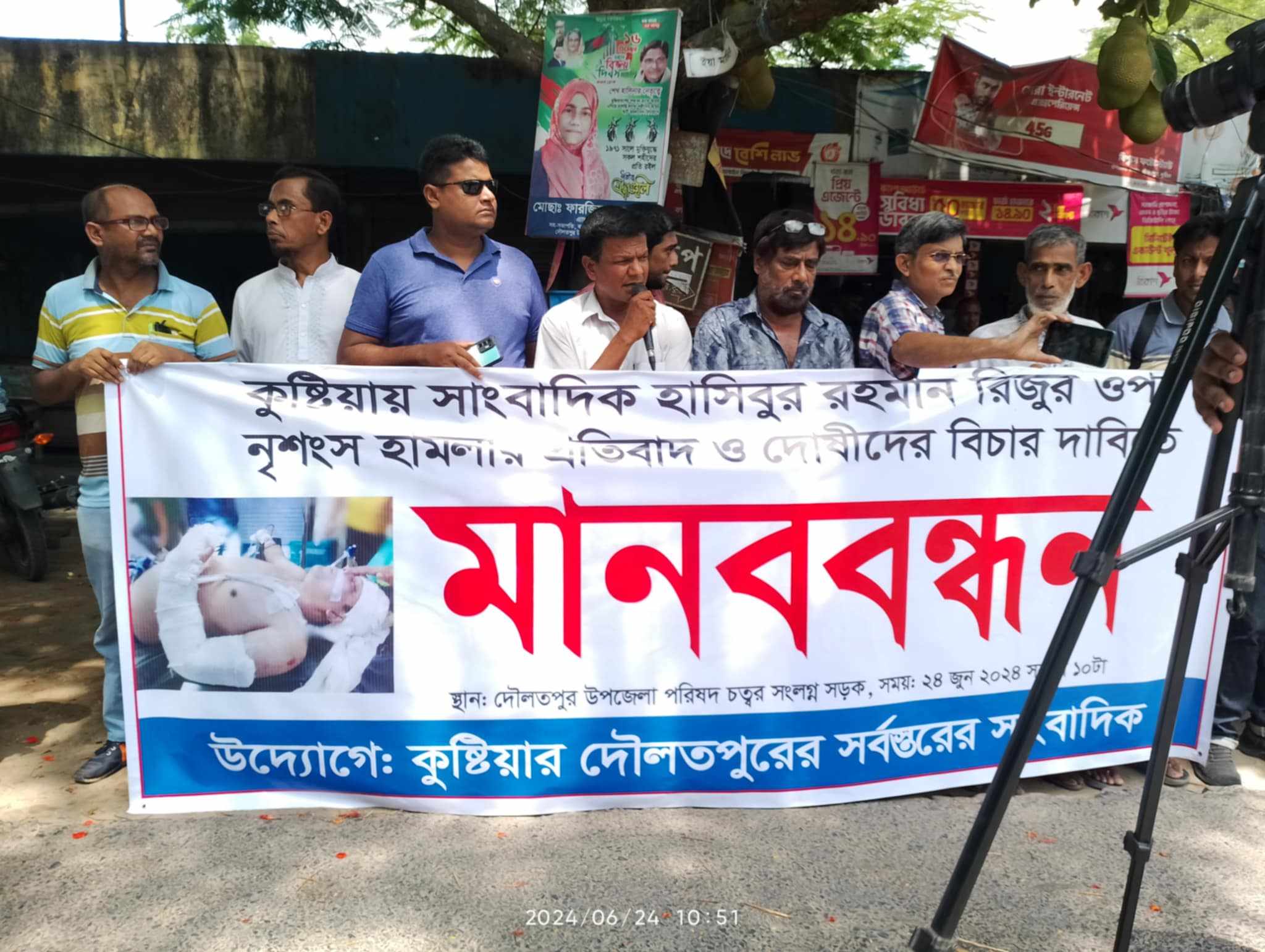 কুষ্টিয়ায় স্থানীয় সাংবাদিক হাসিবুর রহমান রিজুর ওপর নৃশংস হামলার প্রতিবাদ ও দোষীদের বিচার দাবিতে দৌলতপুরে মানববন্ধন অনুষ্ঠিত হয়েছে। সোমবার সকালে দৌলতপুর উপজেলা পরিষদ চত্বর সংলগ্ন সড়কে সর্বস্তরের সাংবাদিকদের উদ্যোগে এই মানববন্ধন হয়।