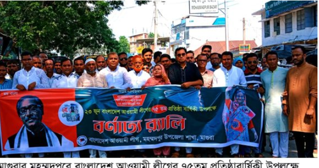 মাগুরার মহম্মদপুরে বাংলাদেশ আওয়ামী লীগের ৭৫তম প্রতিষ্ঠাবার্ষিকী উপলক্ষে বঙ্গবন্ধুর মুর্যালে পূষ্পমাল্য অর্পণ, র্যালি, আলোচনা সভা ও মনোজ্ঞ সাংস্কৃতিক অনুষ্ঠান অনুষ্ঠিত হয়েছে। উপজেলা শাখা আওয়ামী লীগের আয়োজনে আওয়ামী লীগ, যুবলীগ, ছাত্রলীগসহ অঙ্গসংগঠনের নেতা-কর্মী ও নানা শ্রেনিপেশার মানুষের উপস্থিতিতে দিন ব্যাপি নানা কর্মসূচীর মধ্য দিয়ে যথাযোগ্য মর্যাদায় এই প্রতিষ্ঠাবার্ষিকী পালিত হয়।
