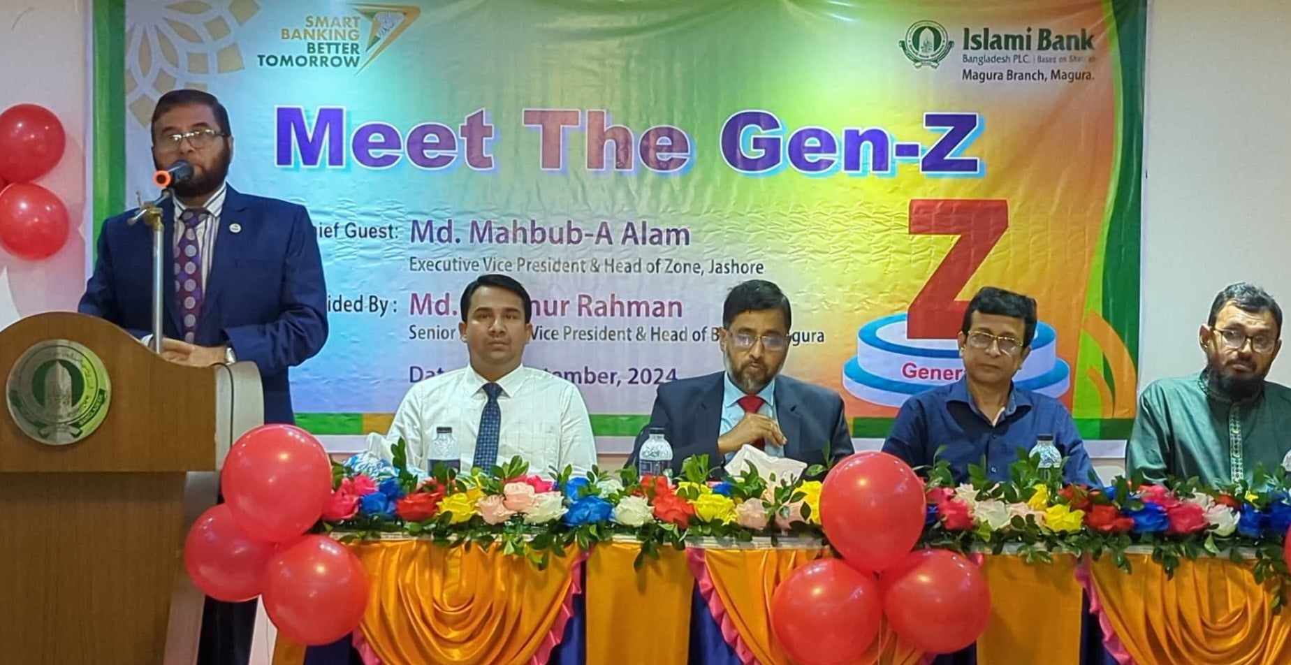 ইসলামী ব্যাংক বাংলাদেশ পি এল সি মাগুরা শাখার উদ্যোগে মিট দি জেন- জেড সভা অনুষ্ঠিত হয়। ১০ সেপ্টেম্বর মঙ্গলবার বেলা ১২ টায় মাগুরা স্টেডিয়াম সংলগ্ন দি রয়েল পার্টি সেন্টার হল রুমে এ সভা অনুষ্ঠিত হয়। ব্যাংকটির প্রিন্সিপাল অফিসার মোঃ মাসুদুর রহমানের সঞ্চালনায় এবং এসিস্ট্যান্ট ভাইস প্রেসিডেন্ট ও মাগুরা শাখা প্রধান মোঃ জামিনুর রহমানের সভাপতিত্বে অনুষ্ঠানে প্রধান অতিথি হিসাবে উপস্থিত ছিলেন এক্সিকিউটিভ ভাইস প্রেসিডেন্ট ও যশোর জন প্রধান মোঃ মাহবুব - এ আলম। প্রাধান অতিথি তার বক্তব্যে বলেন," সারাদেশে আমাদের প্রায় ২ কোটি গ্রাহক আছে এবং ব্যাংকের সাথে প্রায় ৮ কোটি লোক জড়িত। আমাদের ছাত্ররা বাংলাদেশ বিনির্মানে যে নতুন স্বাধীনতা উপহার দিয়েছে আশা করি আমরা এই দেশকে নতুন করে অনেক উপরে নিয়ে যেতে পারবো। অনুষ্ঠানের সভাপতি মোঃ জামিনুর রহমান বলেন,"ছাত্র জনতার বিপ্লব যেন নষ্ট না হয় তার জন্য আমাদের সততার সাথে কাজ করে যেতে হবে। আল্লাহ পাক কোরআান মজিদে বলেছেন হে ঈমানদার গন তোমরা মানুষদেরকে সৎ কাজের আদেশ দিবে এবং অসৎ কাজে নিষেধ করবে। কিন্তু বিগত সরকার আমাদের শিক্ষা ব্যবস্থাকে এমন ভাবে ধ্বংস করে দিয়েছে যার ফলে অনেকেই সততার সাথে কাজ করতে পারে নাই।তারা আমাদের দেশে কর্মসংস্থান সৃষ্টি না করে বিদেশে অর্থ পাচার করেছে।এর ফলে দেশ মেধা শূন্য হয়ে পড়েছে। ১৯৮৩ সাল ইসলামী বাংক বাংলাশের একটি সেরা ব্যাংক হিসাবে প্রতিষ্ঠিত হয়।কৃষি শিল্প সব ক্ষেত্রেই এগিয়ে।ইসলামী ব্যাংক।তাই ছাত্রদের কাছে আমাদের আবেদন ইসলামী ব্যাংকে হিসাব খোলার মাধ্যমে ব্যাংক কে আরো উন্নত শিখরে পৌছে দেয়া। ইসলামী ব্যাংকের সেলফিন অ্যাপের মাধ্যামে কোন খরচ ছাড়া সারা বাংলাদেশের যে কোন জায়গা থেকে টাকা উঠানো ও পাঠানো যায়। অনুষ্ঠানে ছাত্রদের পক্ষ থেকে বক্তব্য রাখেন আশিকুর খান ও আব্দুল মতিন। তারা শিল্প ও কলকারখানা খাতে ব্যাংককে বেশী বেশী ঋণ দেয়ার জন্য পরামর্শ প্রদান করেন।