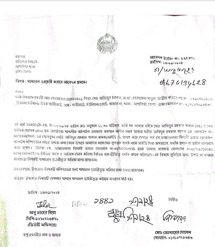 আশুলিয়ায় থানায় হুমকির প্রতিবাদে সুলতান কে জড়িয়ে অজ্ঞাত ব্যাক্তির বিরুদ্ধে সাধারণ ডায়েরি(জিডি)