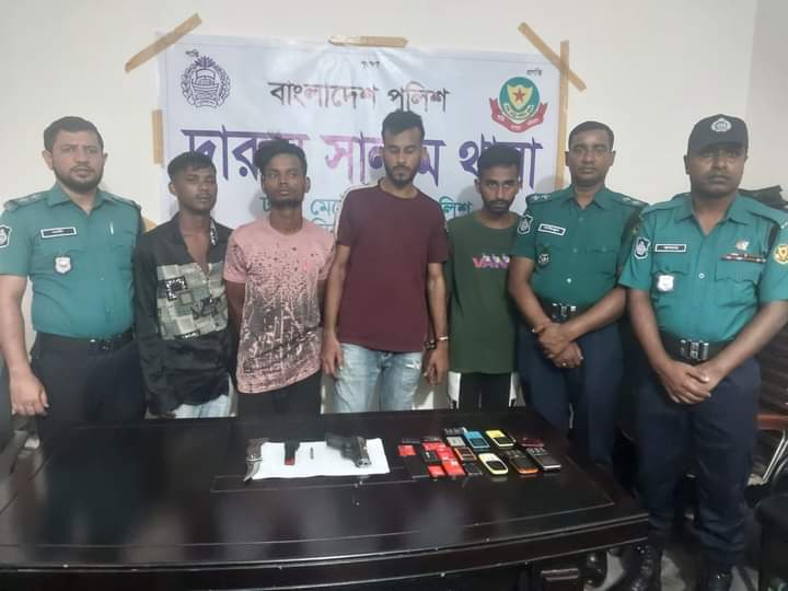 গ্রেফতারকৃতরা হলো- মোঃ হোসাইন, মোঃ রিফাত ওরফে নিপু, মোঃ সোহান ও মোঃ নাইম। গ্রেফতারের সময় তাদের হেফাজত হতে একটি বিদেশি পিস্তল, একটি ম্যাগাজিন, এক রাউন্ড গুলি, একটি সুইস গিয়ার চাকু, ৬টি মোবাইল ও ১২ টি ব্যাটারি জব্দ করা হয়।