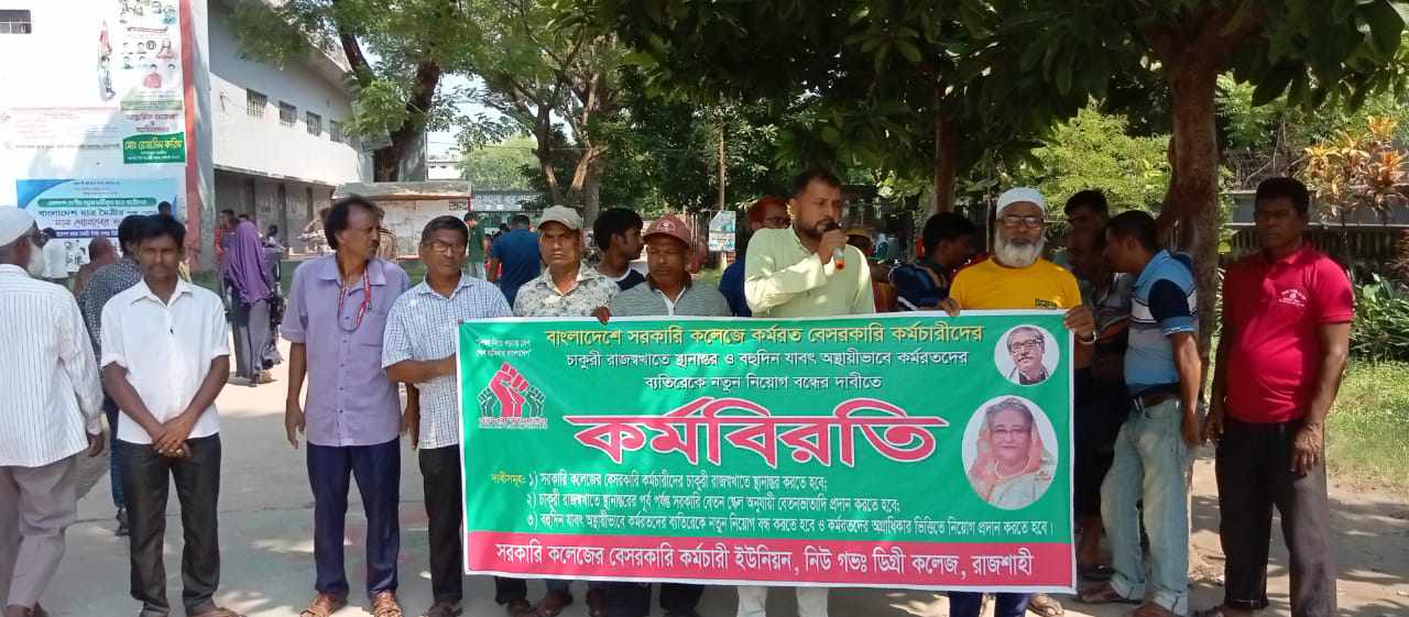 বৃহস্পতিবার সকাল ১০ টা থেকে তিন দফা দাবিতে রাজশাহী নিউ গভ: ডিগ্রী কলেজে কর্মরত বেসরকারি কর্মচারীবৃন্দ এই কর্ম বিরতি পালন করেন। চাকুরী রাজস্বখাতে স্থানান্তর ও বহু দিন যাবৎ অস্থায়ী ভাবে কর্মরতদের ব্যতিরেখে নতুন নিয়োগ বন্ধের দাবি জানিয়েছে রাজশাহী নিউ গভ:ডিগ্রী কলেজে কর্মরত বেসরকারি কর্মচারীবৃন্দ।