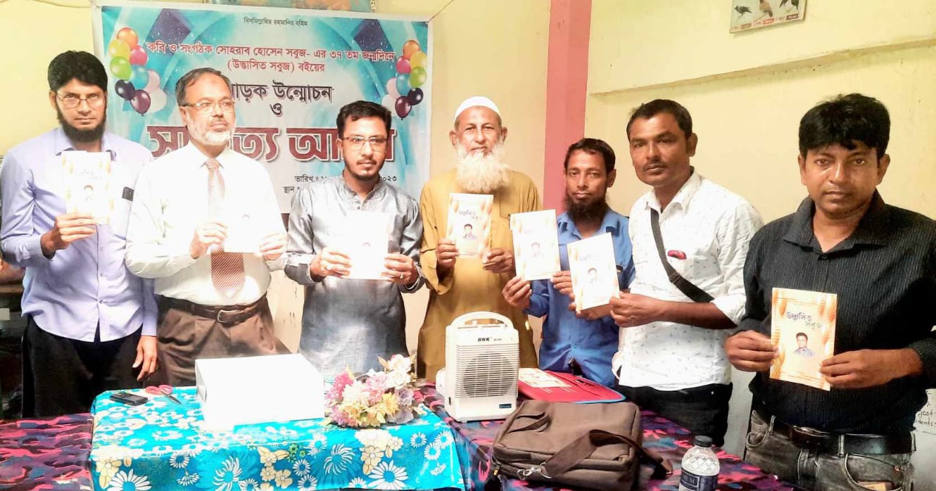 সাতক্ষীরা শহরের সুন্দরবন টেক্সটাইল মিলে 'উদ্ভাসিত সবুজ' বইয়ের মোড়ক উন্মোচন, কেক কাটা ও সাহিত্য আসর অনুষ্ঠিত হয়েছে।